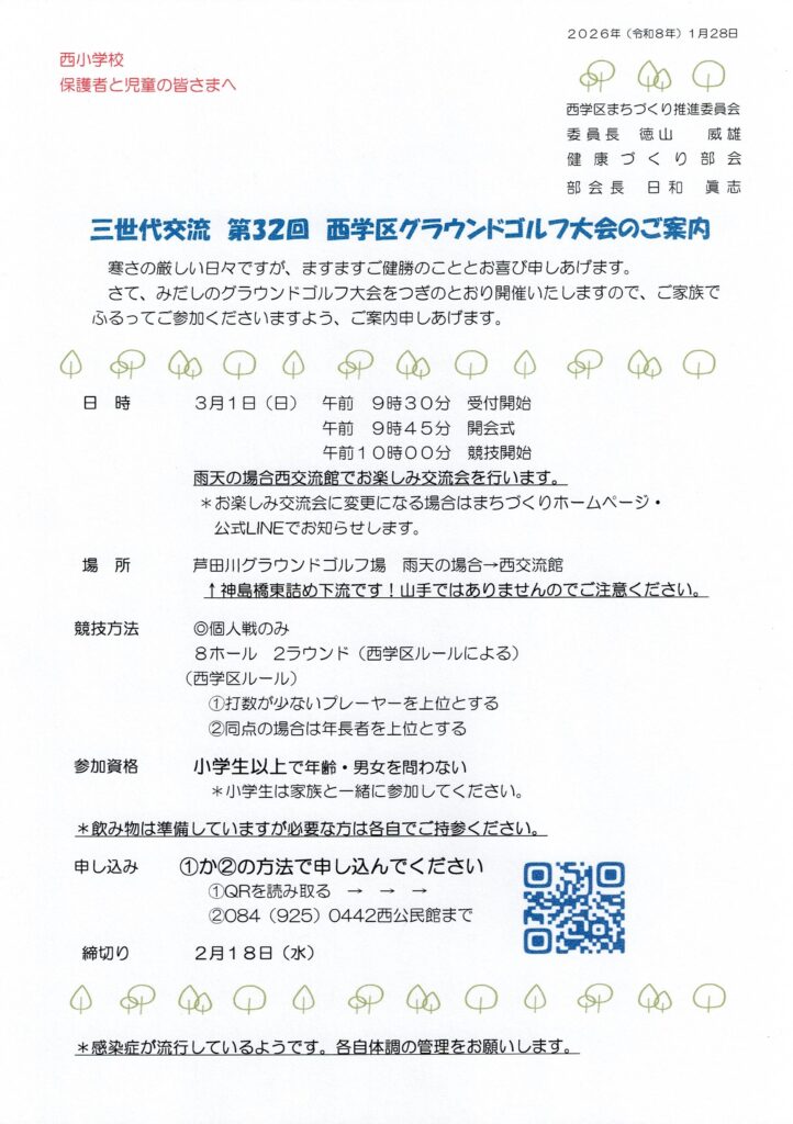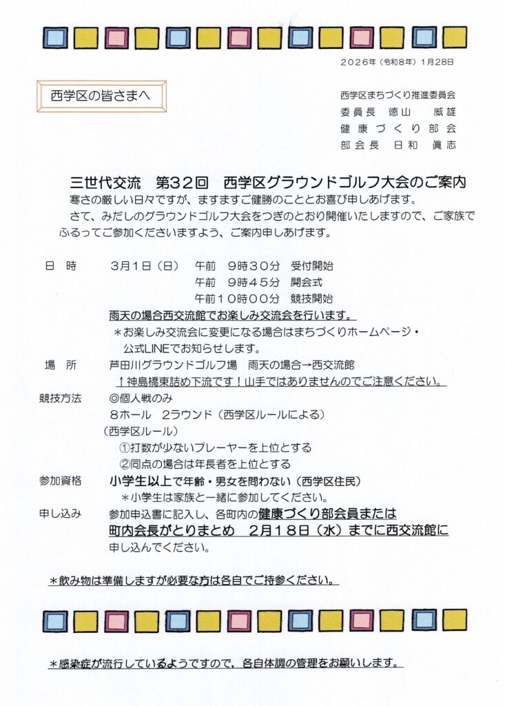 2026年1月30日 / 最終更新日時 : 2026年1月30日 admin 健康づくり部会 第32回『三世代交流 西学区グラウンドゴルフ大会』のご案内 ご案内は(1)西学区のみなさまへ(2)西小学校保護者と児童のみなさまへ‥とあります。 参加申込書はダウンロードしてご使用ください。 グラウンドゴルフ大会参加申込書(取りまとめ用)ダウンロード